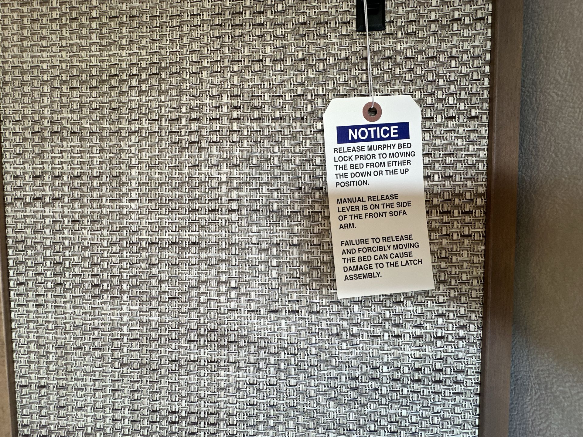 Inside, the RV features tropical-themed décor, including bamboo-style cabinetry and tropical prints, creating a warm and inviting atmosphere. The innovative Murphy Suite design maximizes space by day, providing a spacious living area with comfortable seating, and transforms into a cozy sleeping area by night with a fold-out Murphy bed.