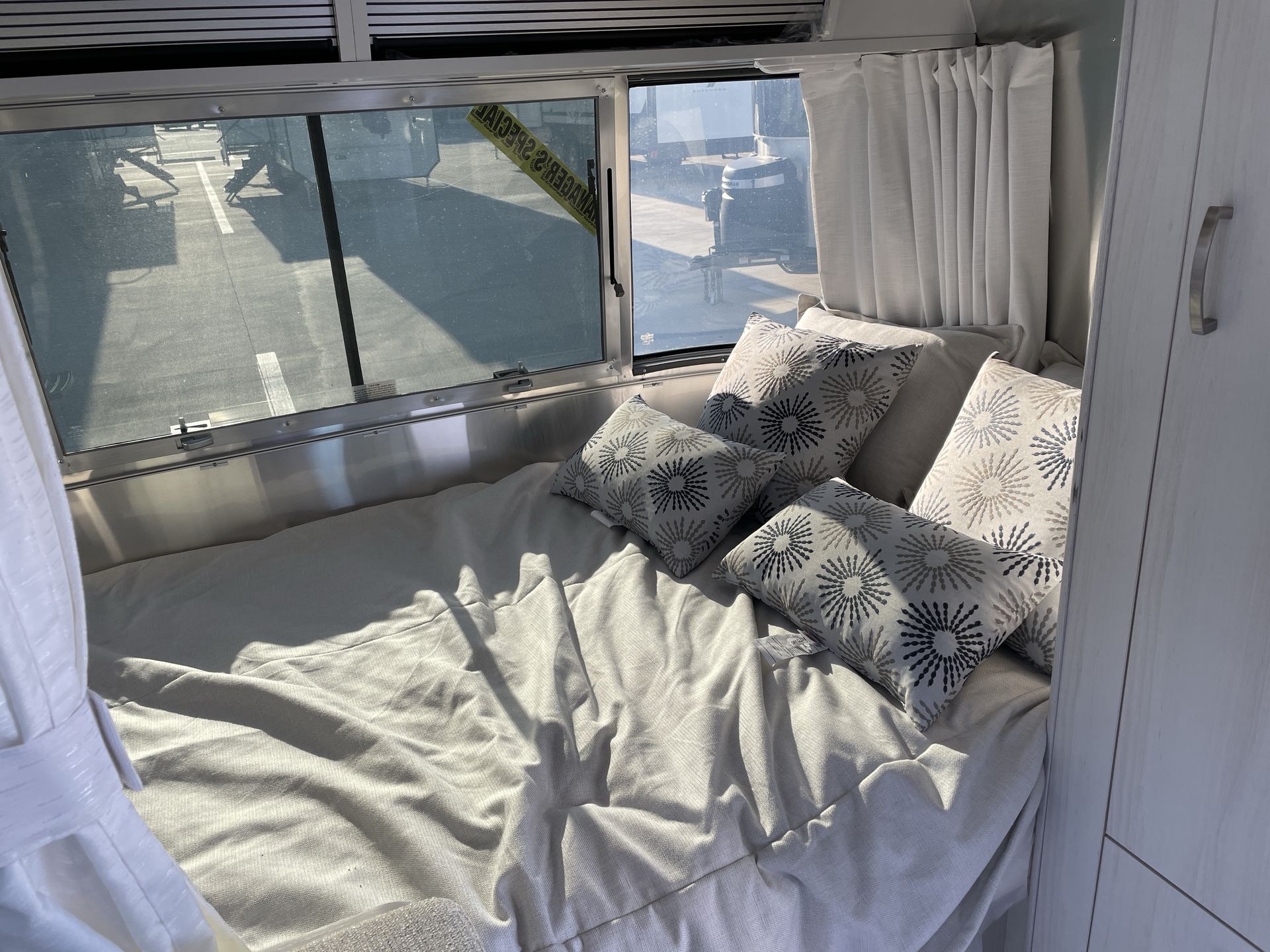 Inside, the Airstream Bambi 20FB makes excellent use of space, offering a cozy and efficient layout. The front of the trailer houses a comfortable bed, making it a perfect retreat after a day of exploration. The plush mattress ensures restful nights, while the surrounding windows invite natural light and provide scenic views.