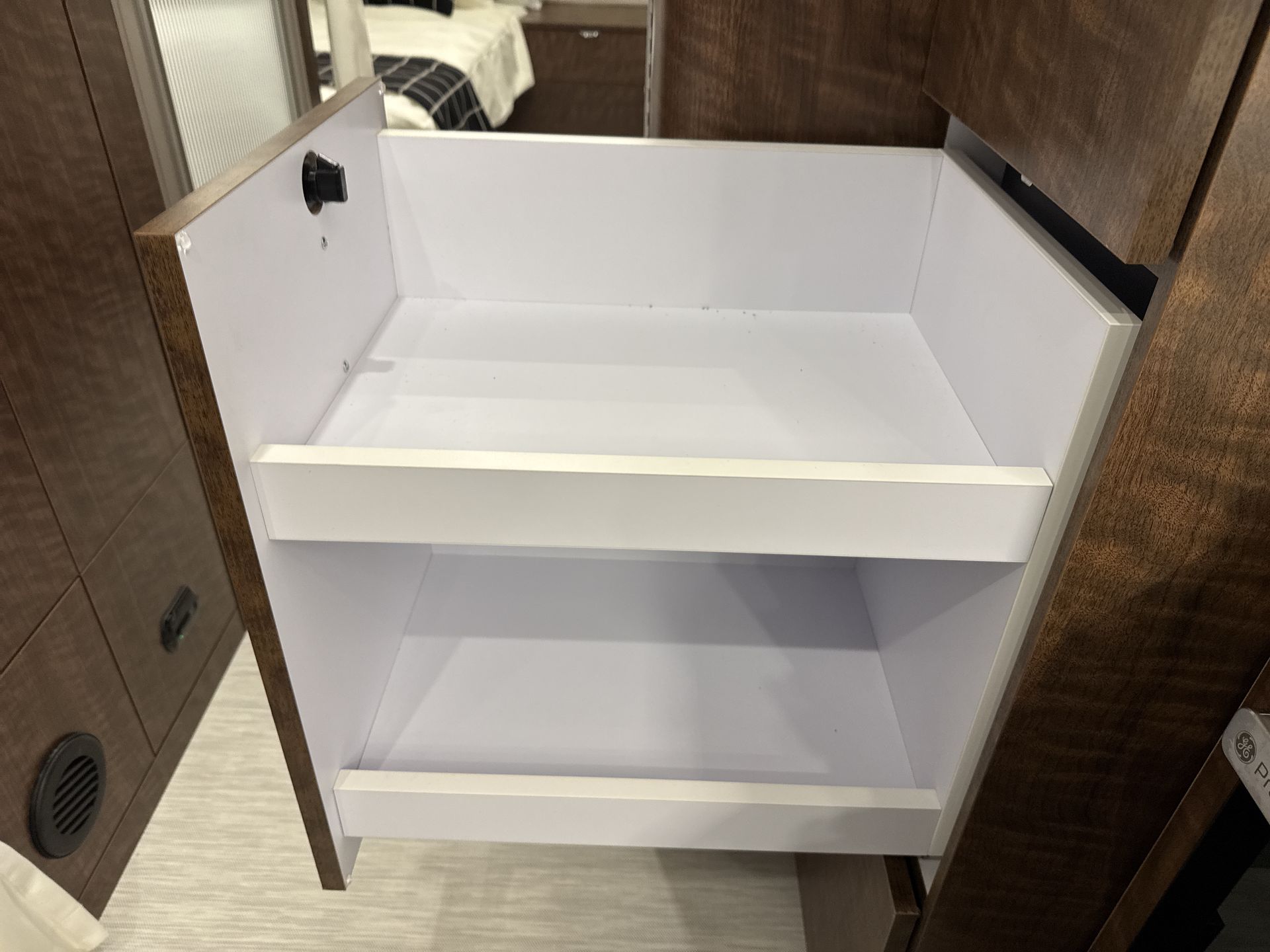 Storage is ample, with carefully designed cabinets and closets to store all your travel necessities securely. The bathroom features a separate shower and toilet area, providing privacy and convenience.