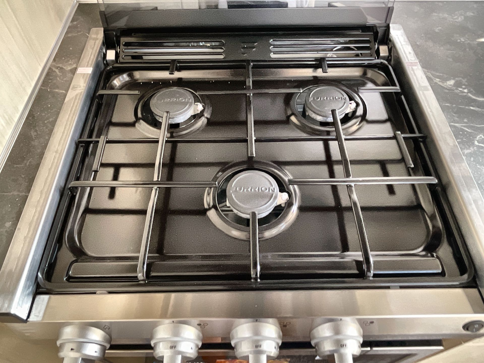 The well-equipped kitchen boasts modern appliances, including a three-burner gas stove, oven, microwave, and a spacious refrigerator. Sleek cabinetry and solid countertops provide both style and ample storage for kitchen necessities.