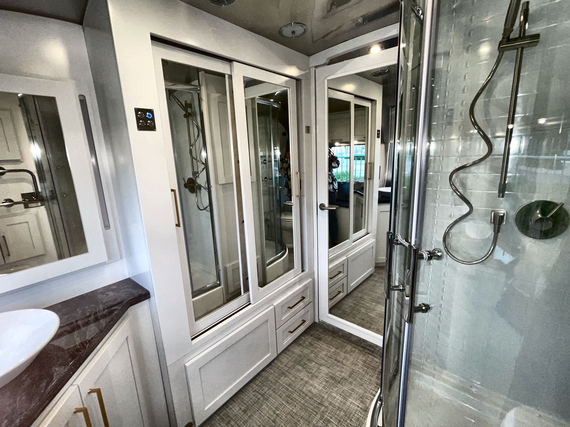 The bathroom spans the entire rear of the trailer and includes a spacious shower with a heated floor, a large vanity, a medicine cabinet, and a heated towel bar. These features add a touch of luxury to your daily routine.
