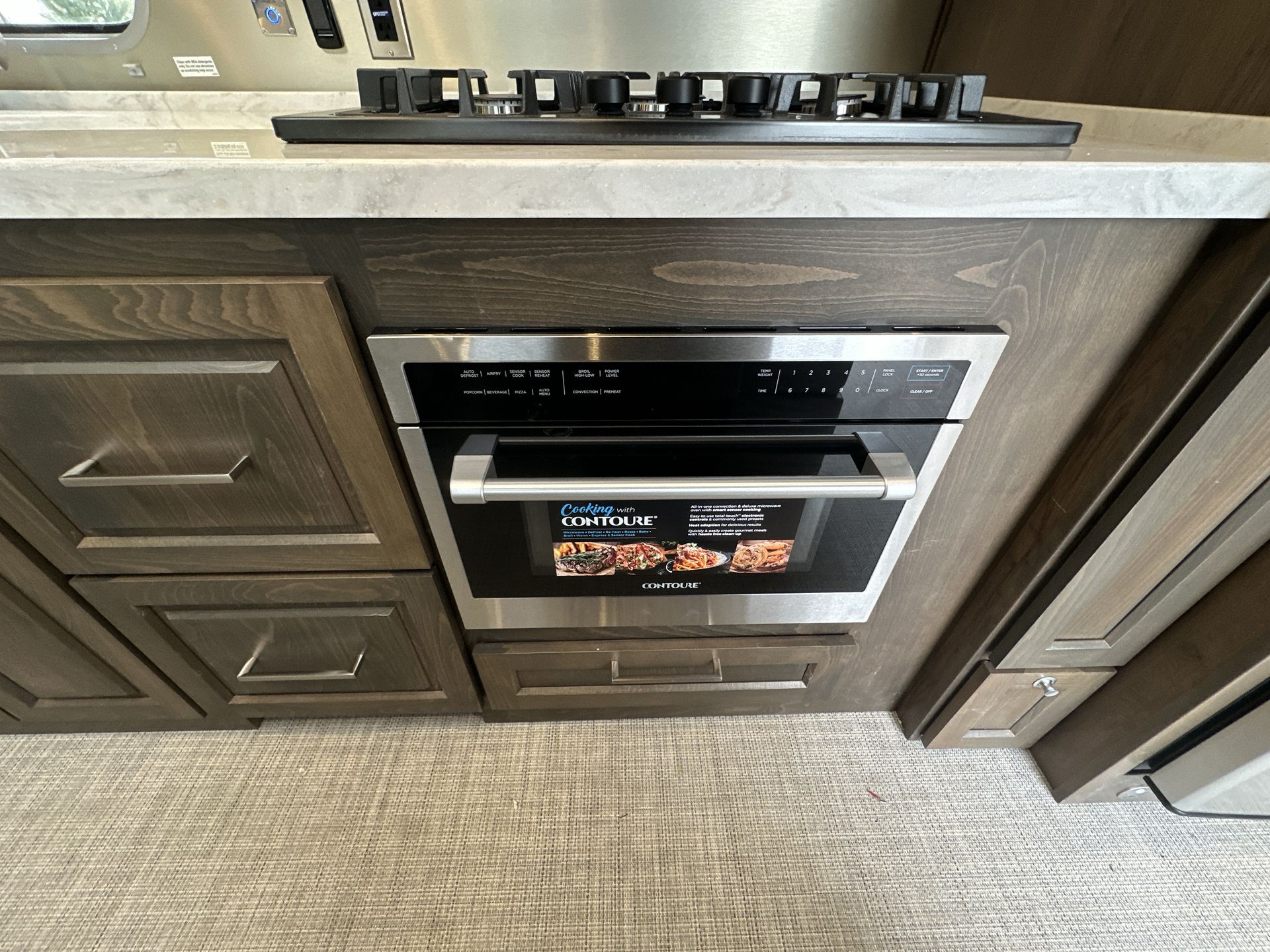 The kitchen is fully equipped with a stainless steel three-burner stove, oven, convection microwave, and a large refrigerator. Solid surface countertops and smart storage solutions make meal preparation easy and enjoyable.