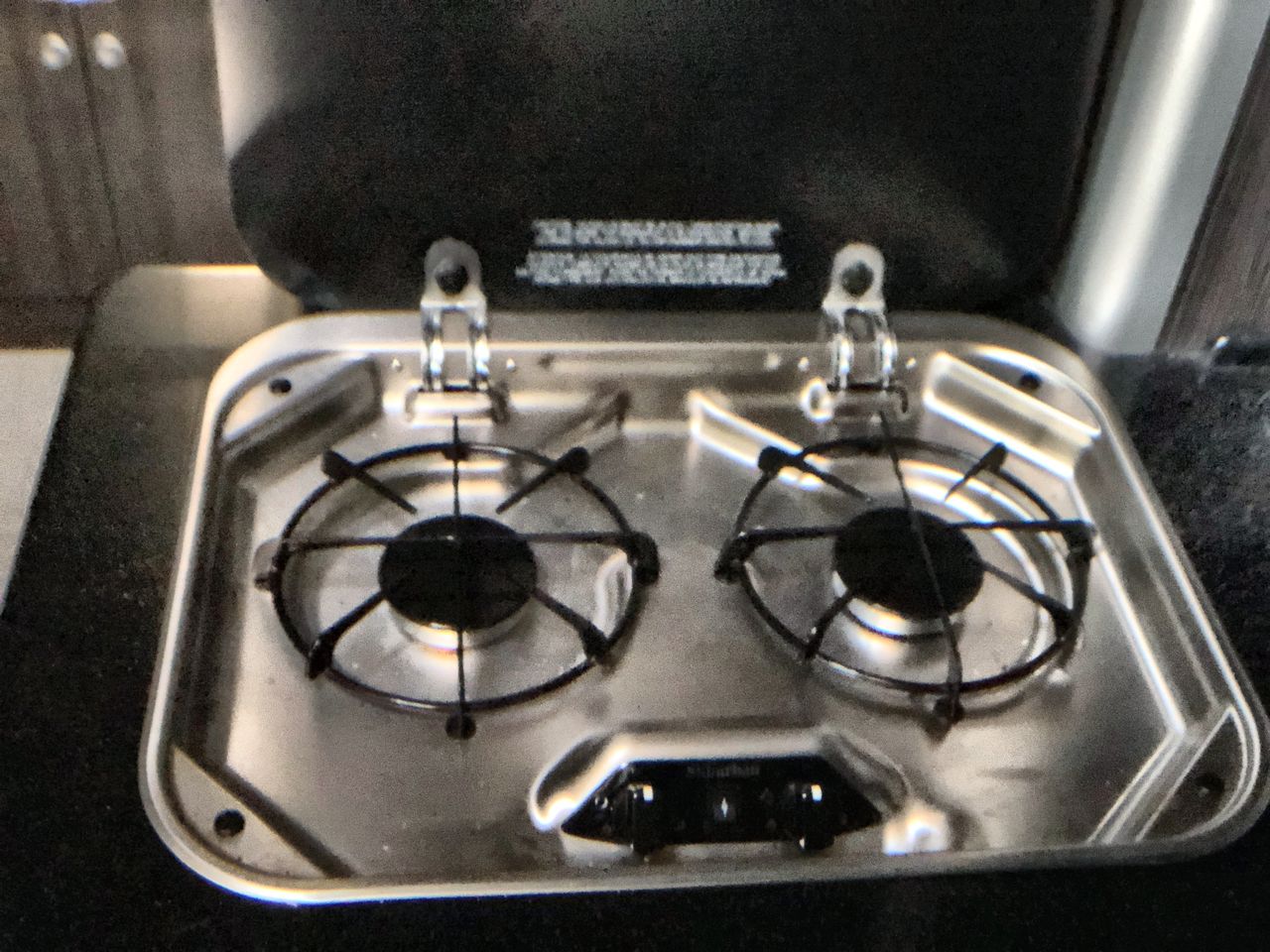 The kitchen is equipped with high-end appliances, including a two-burner gas stove, a convection microwave oven, and a mid-size refrigerator with a freezer. Solid-surface countertops, a large stainless steel Kohler® sink, and a slide-out pantry enhance both functionality and style, making it easy to prepare homemade meals on the road.