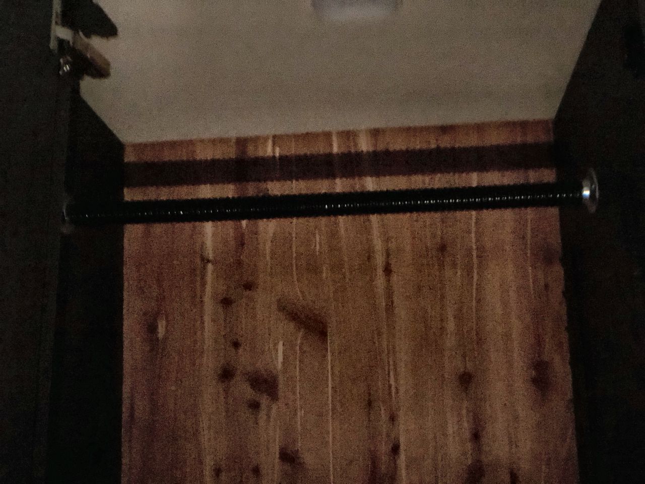 The full bathroom spans the entire rear of the RV, offering a spa-like retreat with a spacious shower featuring a teak inlay, a porcelain toilet, and a large vanity with a mirrored cabinet. A cedar-lined closet inside the bathroom provides ample storage, and a single door closes off the space for privacy.