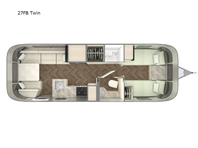 If you want a model just like 27FB, but you would prefer to have two twin-size beds in place of the one RV queen bed, then you must check out this International travel trailer! This trailer has a front bedroom with two twin beds for your convenience, and the kitchen has a three-burner cooktop, stainless steel sink, and an 8-cu. ft. refrigerator so that you can create new and exciting dishes each time you are away. This trailer also has excellent storage space with the overhead storage lockers, the wardrobe with hanging bar, the under-bed storage, and the exterior storage compartment. You can also find great entertainment as you spend your time in this trailer because the two LED HDTVs will allow you to watch a movie on the Blu-Ray DVD player. Every time you step foot into the Airstream International travel trailer, you will feel as if you are breathing in a breath of fresh air! The fresh coastal décor was inspired by the waterfront, and the stylish interior delivers a relaxing environment and comfortable luxury. The panoramic windows increase the amount of natural sunlight that streams through to the interior, but they also have blackout shades that you can close whenever you need a darkened room. The beautiful handcrafted marine-grade Lite-Ply laminated cabinetry is an attractive base for the overhead storage lockers that have sliding doors and LED lighting. The dimmable interior LED lighting will create the perfect amount of illumination for you as you spend time indoors. The exterior has excellent features as well with its enclosed aluminum insulated heated underbelly, unique front door key with heavy-duty deadbolt, optional solar package, solar front window protection, and exterior shower with hot and cold water. We have 5 27FB Twin availableView InventorySpecificationsSleeps 4 Length 28 ft 2 in Ext Width 8 ft 6 in Ext Height 9 ft 7 in Int Height 6 ft 7 in Interior Color Coastal Cove with Aqua Ultraleather, Coastal Cove with Seashell Ultraleather Hitch Weight 850 lbs GVWR 7600 lbs Dry Weight 6000 lbs Cargo Capacity 1600 lbs Fresh Water Capacity 39 gals Grey Water Capacity 39 gals Black Water Capacity 39 gals Tire Size ST225/75R15 Furnace BTU 30000 btu Available Beds Two Twin Refrigerator Type 12V Electric w/Freezer Refrigerator Size 8 cu ft Cooktop Burners 3 Number of Awnings 1 LP Tank Capacity 30 lbs Water Heater Type Tankless On Demand LP AC BTU 15000 btu TV Info LR HD 12V TV; BR LED HDTV Awning Info Powered Zipdee with Sunbrella Fabric; Rear & Roadside Window Awnings Axle Count 2 Number of LP Tanks 2 Shower Type Shower w/Seat Electrical Service 30 amp Similar Travel Trailer Floorplans