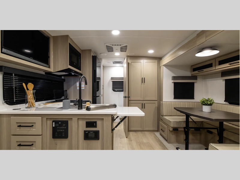 Sleeps 4 Slides 1 Length 22 ft 4 in Ext Width 8 ft Ext Height 10 ft 11 in Interior Color Chocolate, Stone Exterior Color Champagne, White Hitch Weight 681 lbs Dry Weight 4977 lbs Cargo Capacity 1864 lbs Fresh Water Capacity 54 gals Grey Water Capacity 30 gals Black Water Capacity 30 gals Furnace BTU 20000 btu Available Beds Murphy Refrigerator Type 12 Volt Cooktop Burners 3 Number of Awnings 1 LP Tank Capacity 30 lbs Water Heater Type Quick Recovery AC BTU 15000 btu TV Info LR 32" LED TV Awning Info 14' Power with Adjustable Rain Dump and LED Lights Axle Count 2 Number of LP Tanks 2 Shower Type Radius Similar Floorplans