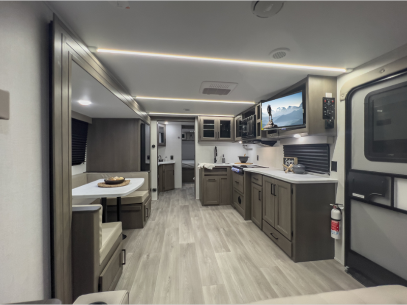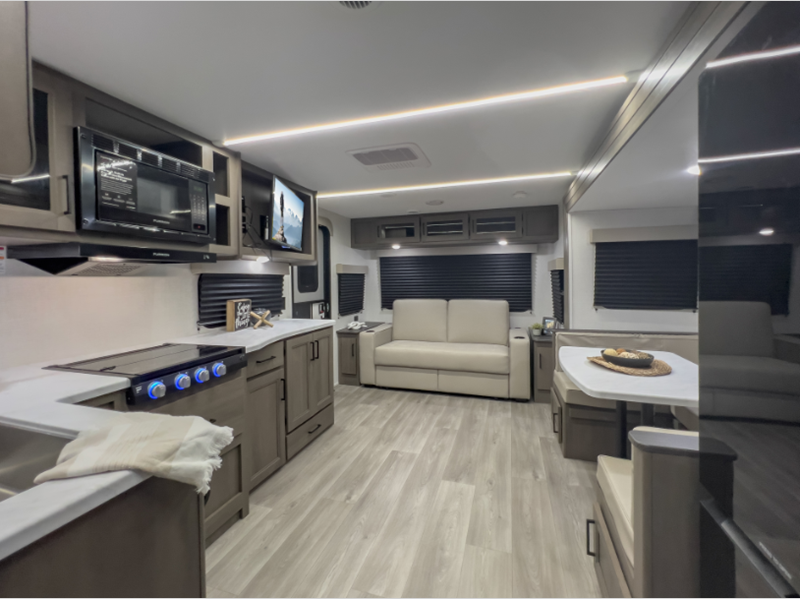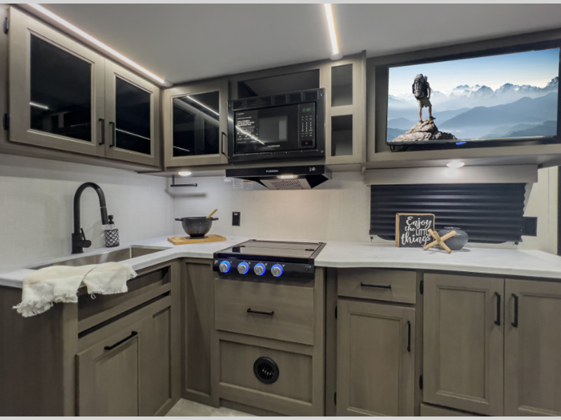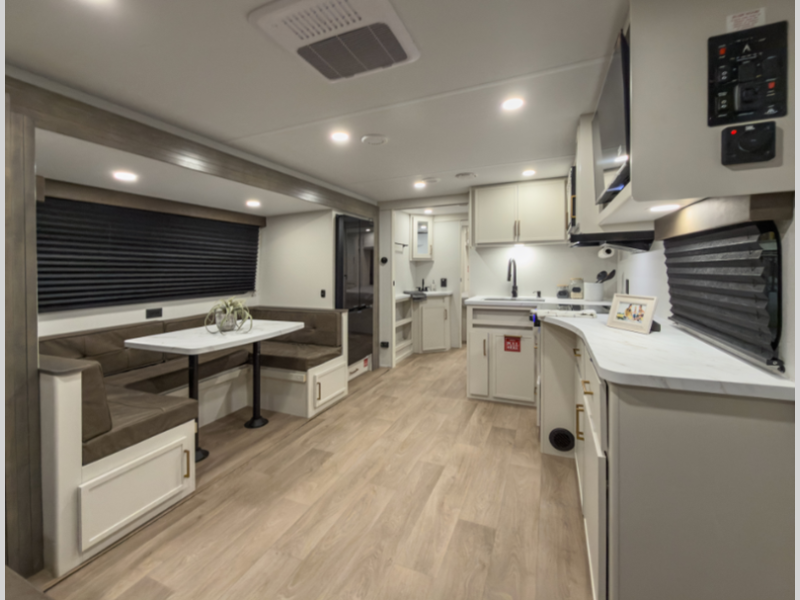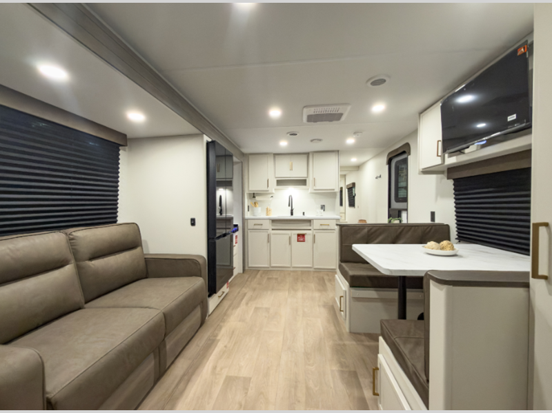 The 4-Season Protection Package includes a heated and enclosed underbelly with suspended tanks, a 35k BTU furnace, EvenFlow ductless heating throughout, and more features that help extend your camping season. There is a 6' 6" interior height to give you plenty of head room, and the thermoformed and seamless countertops in the kitchen will be easy to keep clean. You will also find many exterior conveniences, such as a universal docking station, a bottle opener and Leash Link for you furry friends, and a power tongue jack so you can easily hitch up when you're ready to go home.