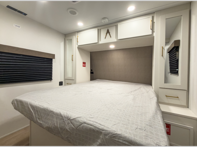 Sleeps 2 Slides 1 Length 33 ft 11 in Ext Width 8 ft Ext Height 11 ft Int Height 6 ft 6 in Hitch Weight 720 lbs GVWR 8800 lbs Dry Weight 7166 lbs Fresh Water Capacity 56 gals Grey Water Capacity 78 gals Black Water Capacity 39 gals Tire Size ST225/75R15LRE Furnace BTU 35000 btu Available Beds Queen Refrigerator Type 12V French Door Refrigerator Size 10.7 cu ft Convection Cooking Yes Cooktop Burners 3 Number of Awnings 1 LP Tank Capacity 20 lbs Water Heater Type Furrion Tankless AC BTU 15000 btu Cargo Deck Size 0 ft TV Info LR 32" TV Awning Info 17' Power w/LED Light Axle Count 2 Washer/Dryer Available Yes Number of LP Tanks 2 Shower Type Walk-In Shower Electrical Service 50 amp Solar Wattage 200 watts Similar Floorplans