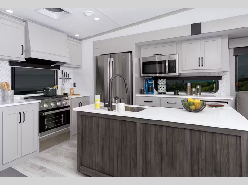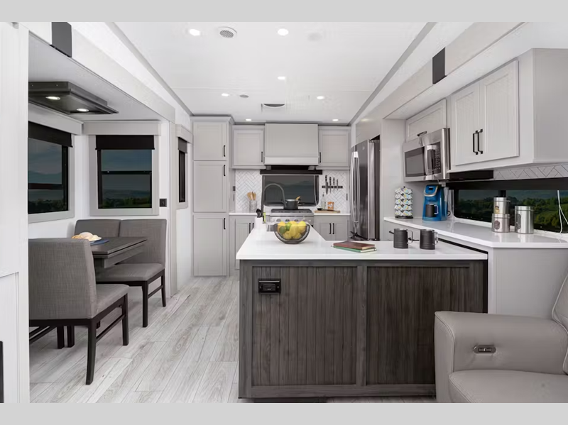 Sleeps 5 Slides 3 Length 36 ft 7 in Ext Height 13 ft 4 in Interior Color Kingston Hitch Weight 2410 lbs Dry Weight 12245 lbs Cargo Capacity 3740 lbs Fresh Water Capacity 75 gals Grey Water Capacity 87 gals Black Water Capacity 49 gals Tire Size ST235/80R16G Furnace BTU 35000 btu Available Beds King Refrigerator Type GE Energy Star Residential with Ice Maker Refrigerator Size 18 cu ft Cooktop Burners 3 Number of Awnings 1 Axle Weight 7000 lbs LP Tank Capacity 30 lbs Water Heater Type On Demand AC BTU 15000 btu TV Info LR 50" LED Smart TV Awning Info 17' Electric with LED Lights Axle Count 2 Washer/Dryer Available Yes Number of LP Tanks 2 Shower Type Shower w/Seat Electrical Service 50 amp Similar Floorplans