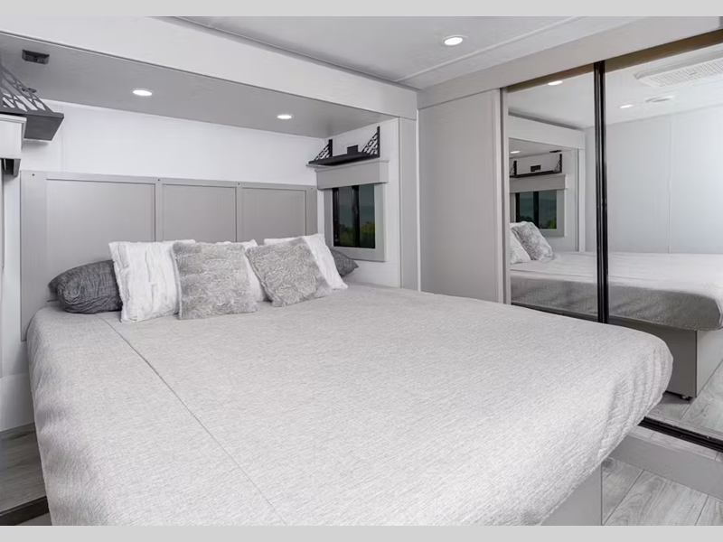 Sleeps 7 Slides 4 Length 42 ft 5 in Ext Height 13 ft 4 in Interior Color Kingston Hitch Weight 2705 lbs Dry Weight 14451 lbs Cargo Capacity 2254 lbs Fresh Water Capacity 75 gals Grey Water Capacity 135 gals Black Water Capacity 98 gals Tire Size ST235/80R16G Furnace BTU 35000 btu Available Beds King, Queen Refrigerator Type GE Energy Star Residential with Ice Maker Refrigerator Size 18 cu ft Cooktop Burners 3 Shower Size 48" x 30" Number of Awnings 2 Axle Weight 7000 lbs LP Tank Capacity 30 lbs Water Heater Type On Demand AC BTU 15000 btu TV Info LR 50" LED Smart TV Awning Info 10' and 16' Electric with LED Lights Axle Count 2 Washer/Dryer Available Yes Number of LP Tanks 2 Shower Type Shower w/Seat Electrical Service 50 amp Similar Floorplans