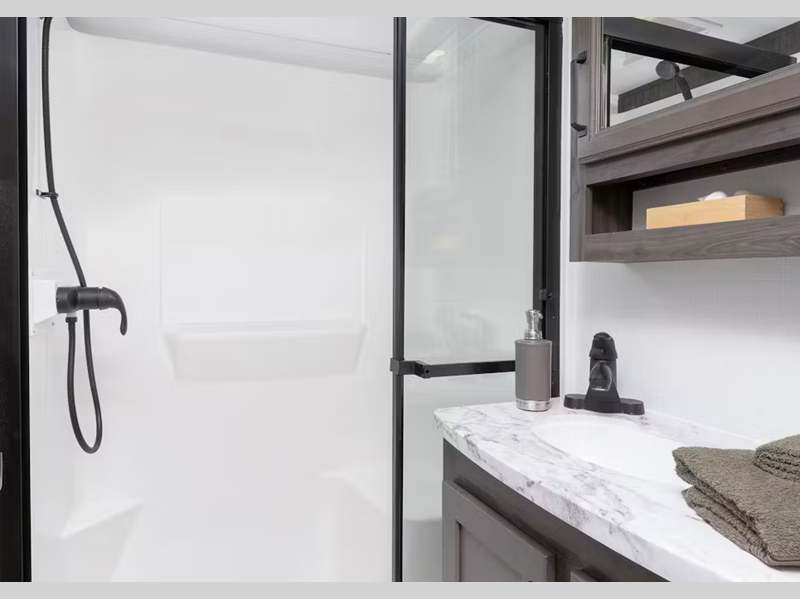 - Fiberglass shower w/decorative glass enclosure, skylight and foot shelf (model specific)